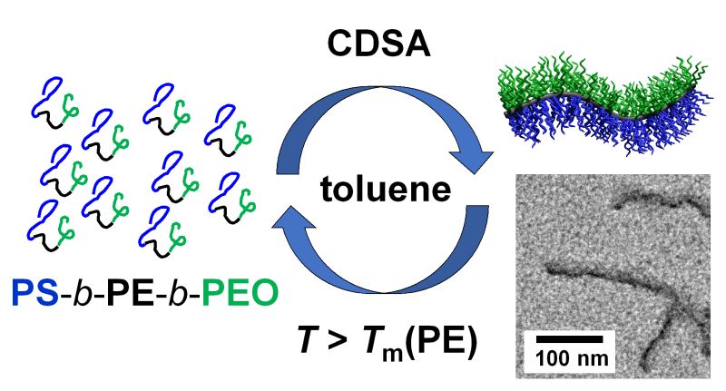 Surface-compartmentalized micellar nanostructures (Janus and patchy micelles) have gained increasing interest due to their unique properties opening highly relevant applications, e.g., as efficient particulate surfactants, compatibilizers in polymer blends, or templates for catalytically active nanoparticles. We present a facile method for the production of worm-like Janus micelles based on crystallization-driven self-assembly of a double crystalline triblock terpolymer with a crystallizable polyethylene middle block and two highly incompatible corona blocks, polystyrene and poly(ethylene oxide) (PEO). This approach enables the production of amphiphilic Janus micelles with excellent interfacial activity by a comparably simple heating and cooling protocol directly in solution.